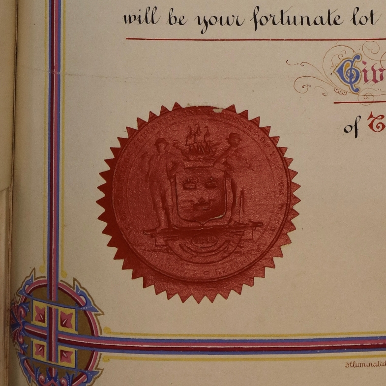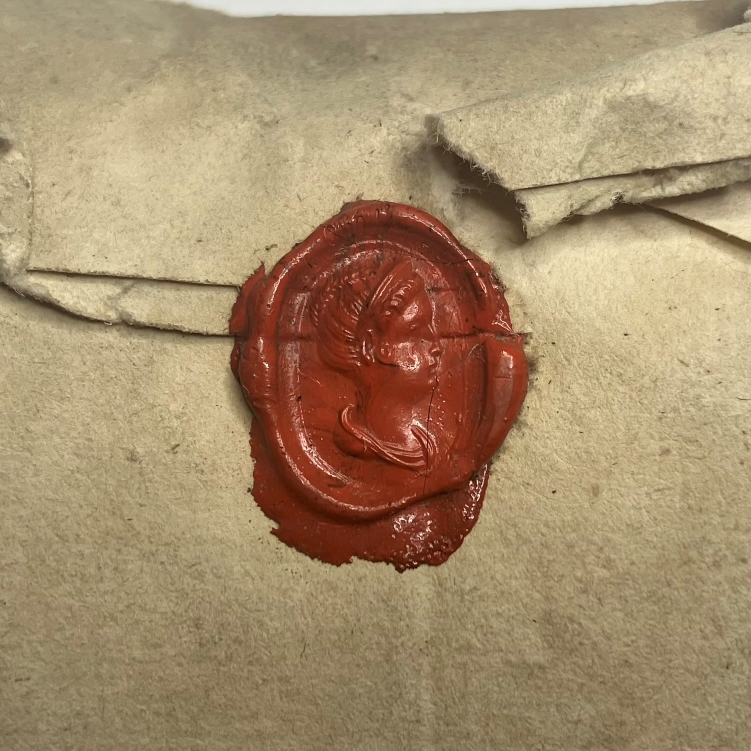 Wax (beeswax, pigmented or plain) was the most commonly used material for seals until the late 17th century, when shellac (the resinous secretion of the Asian ‘lac’ insect, usually Kerria lacca) took over. Lead was famously used for papal seals or bulla, and wafer seals feature a piece of coloured paper or paste – sometimes sandwiched between two plain pieces of paper – into which a raised stamp impression is made.